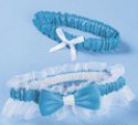The blue Satin Garter Bow Set. Keep one as a memento of your special day and toss the other one into the crowd at the wedding reception! Both elastic garters have a coordinating bow, and one has an organza ruffle. 6"